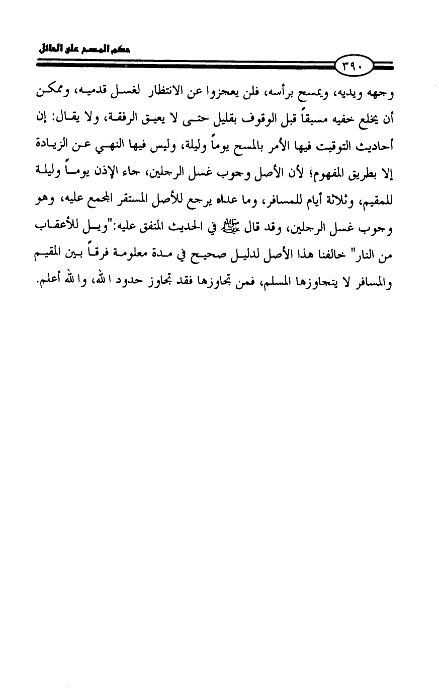 وجهه ويديه، ويمسح برأسه، فلن يعجزوا عن الانتظار لغسل قدميه، وممكن أن يخلع خفيه مسبقاً قبل الوقوف بقليل حتى لا يعيق الرفقة، ولا يقال: إن أحاديث التوقيت فيها الأمر بالمسح يوماً وليلة، وليس فيها النهي عن الزيادة إلا بطريق المفهوم؛ لأن الأصل وجوب غسل الرجلين، جاء الإذن يوماً وليلة للمقيم، وثلاثة أيام للمسافر، وما عداه يرجع للأصل المستقر المجمع عليه، وهو وجوب غسل الرجلين، وقد قال - صلى الله عليه وسلم - في الحديث المتفق عليه:"ويل للأعقاب من النار" خالفنا هذا الأصل لدليل صحيح في مدة معلومة فرقاً بين المقيم والمسافر لا يتجاوزها المسلم، فمن تجاوزها فقد تجاوز حدود الله، والله أعلم.