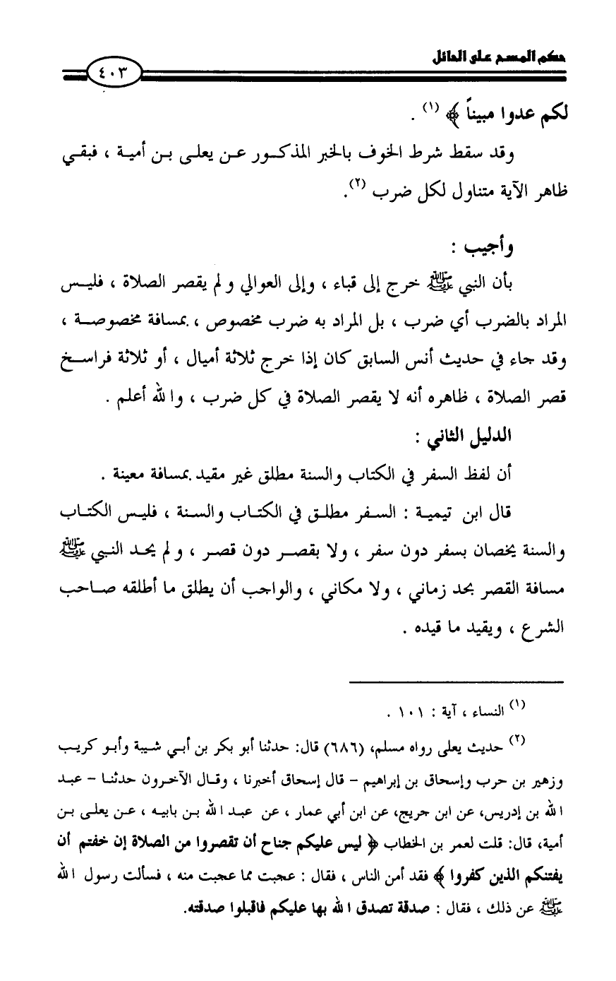 (¬2) حديث يعلى رواه مسلم، (686) قال: حدثنا أبو بكر بن أبي شيبة وأبو كريب وزهير بن حرب وإسحاق بن إبراهيم - قال إسحاق أخبرنا، وقال الآخرون حدثنا - عبد الله بن إدريس، عن ابن جريج، عن ابن أبي عمار، عن عبد الله بن بابيه، عن يعلى بن أمية، قال: قلت لعمر بن الخطاب {ليس عليكم جناح أن تقصروا من الصلاة إن خفتم أن يفتنكم الذين كفروا} فقد أمن الناس، فقال: عجبت مما عجبت منه، فسألت رسول الله - صلى الله عليه وسلم - عن ذلك، فقال: صدقة تصدق الله بها عليكم فاقبلوا صدقته.