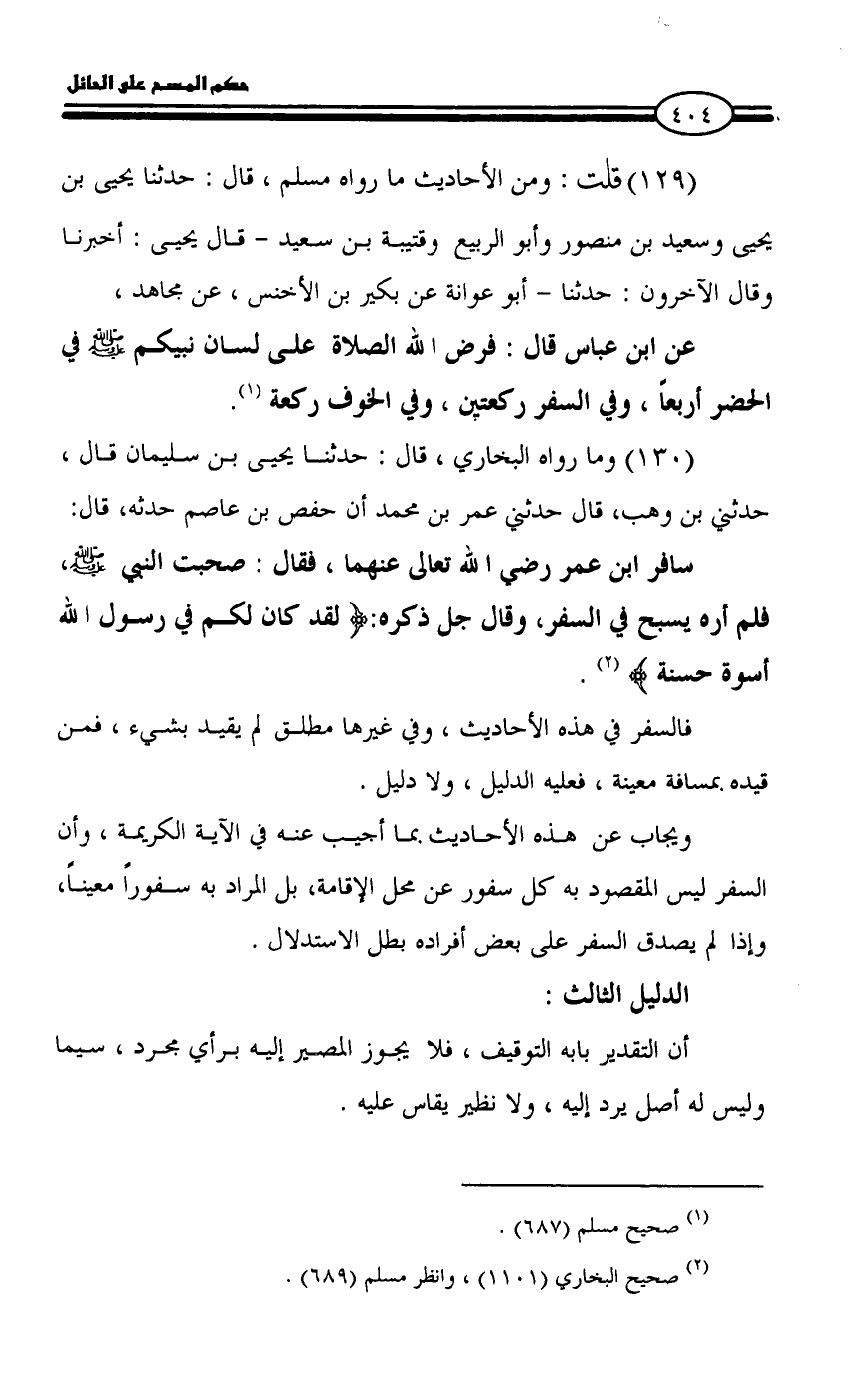 ويجاب عن هذه الأحاديث بما أجيب عنه في الآية الكريمة، وأن السفر ليس المقصود به كل سفور عن محل الإقامة، بل المراد به سفوراً معيناً، وإذا لم يصدق السفر على بعض أفراده بطل الاستدلال.