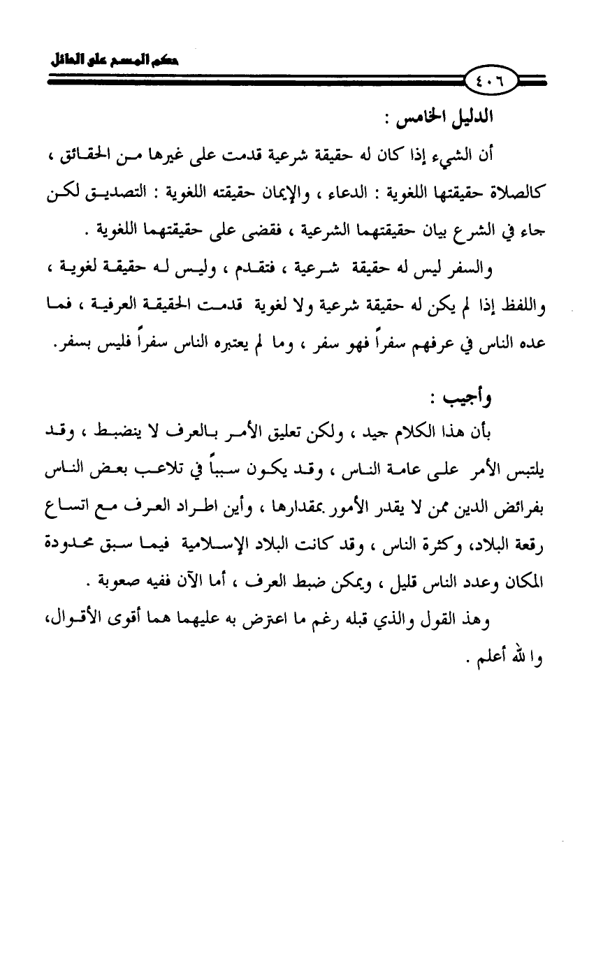 بأن هذا الكلام جيد، ولكن تعليق الأمر بالعرف لا ينضبط، وقد يلتبس الأمر على عامة الناس، وقد يكون سبباً في تلاعب بعض الناس بفرائض الدين ممن لا يقدر الأمور بمقدارها، وأين اطراد العرف مع اتساع رقعة البلاد، وكثرة الناس، وقد كانت البلاد الإسلامية فيما سبق محدودة المكان وعدد الناس قليل، ويمكن ضبط العرف، أما الآن ففيه صعوبة.