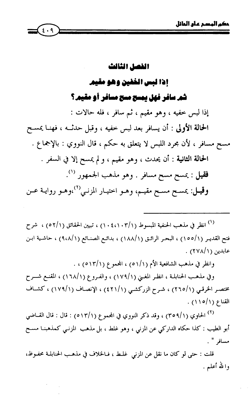 (¬2) الحاوي (1/ 359)، وقد ذكر النووي في المجموع (1/ 513): قال: قال القاضي أبو الطيب: كذا حكاه الداركي عن المزني، وهو غلط، بل مذهب المزني كمذهبنا مسح مسافر ".