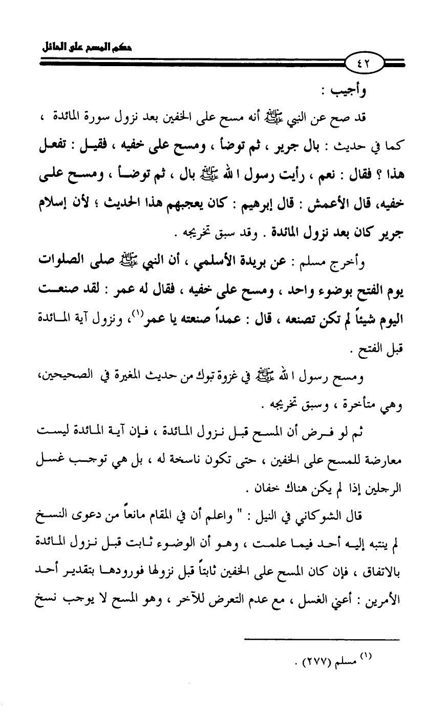 قال الشوكاني في النيل: " واعلم أن في المقام مانعاً من دعوى النسخ لم ينتبه إليه أحد فيما علمت، وهو أن الوضوء ثابت قبل نزول المائدة بالاتفاق، فإن كان المسح على الخفين ثابتاً قبل نزولها فورودها بتقدير أحد الأمرين: أعني الغسل، مع عدم التعرض للآخر، وهو المسح لا يوجب نسخ