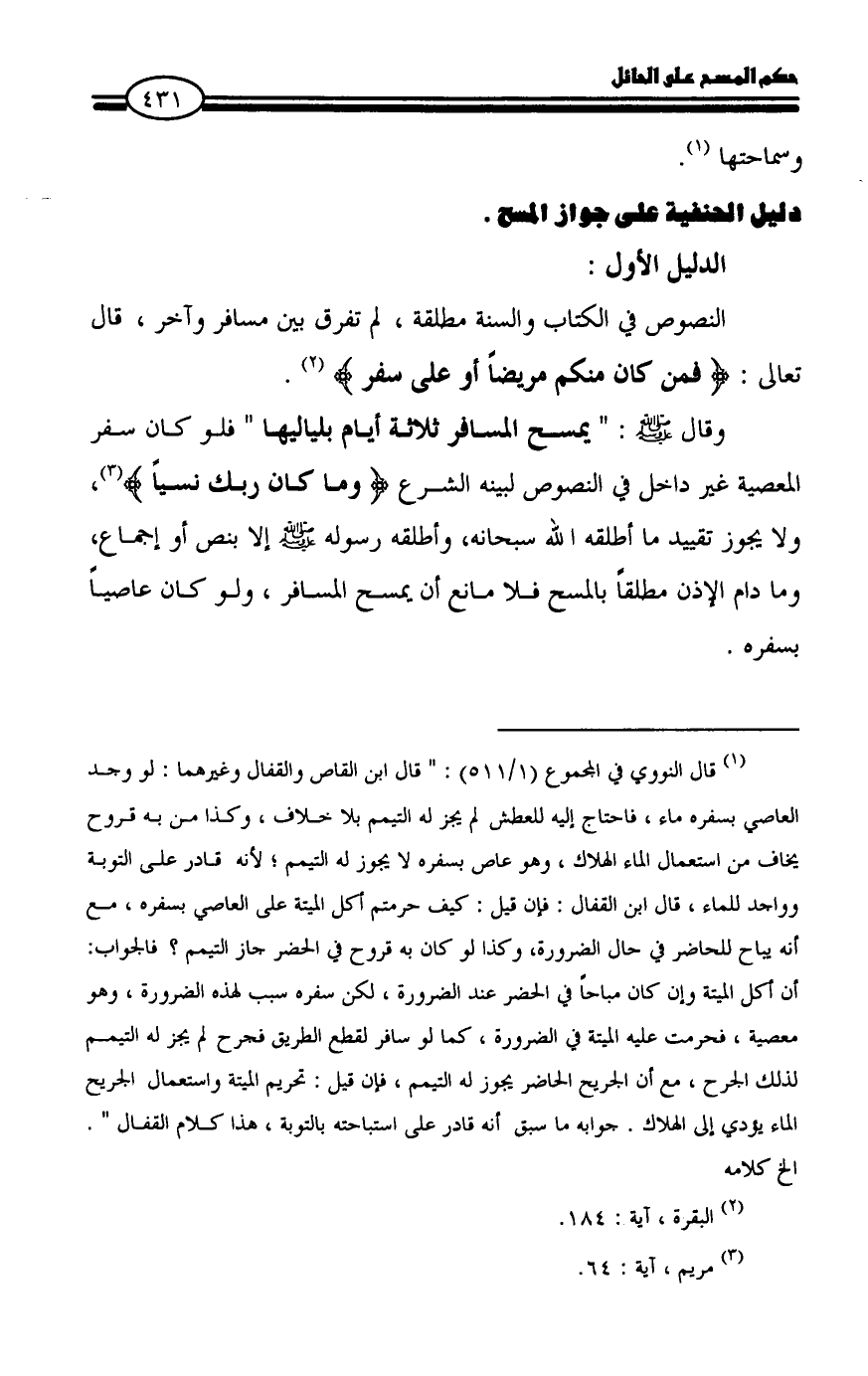وقال - صلى الله عليه وسلم -: " يمسح المسافر ثلاثة أيام بلياليها " فلو كان سفر المعصية غير داخل في النصوص لبينه الشرع {وما كان ربك نسياً} (¬3)،