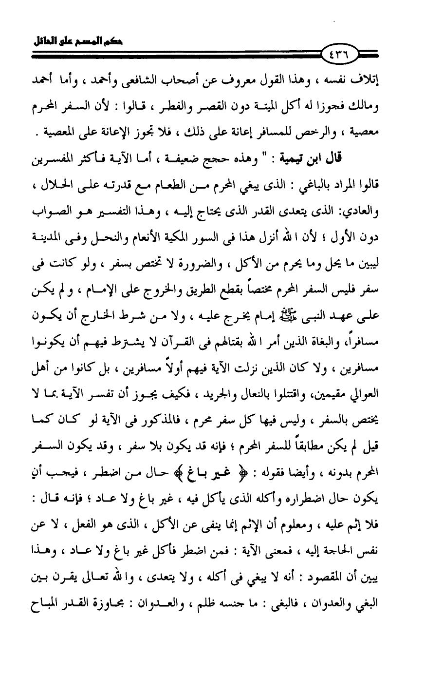 قال ابن تيمية: " وهذه حجج ضعيفة، أما الآية فأكثر المفسرين قالوا المراد بالباغي: الذى يبغي المحرم من الطعام مع قدرته على الحلال، والعادي: الذى يتعدى القدر الذى يحتاج إليه، وهذا التفسير هو الصواب دون الأول؛ لأن الله أنزل هذا فى السور المكية الأنعام والنحل وفى المدينة ليبين ما يحل وما يحرم من الأكل، والضرورة لا تختص بسفر، ولو كانت فى سفر فليس السفر المحرم مختصاً بقطع الطريق والخروج على الإمام، ولم يكن على عهد النبى - صلى الله عليه وسلم - إمام يخرج عليه، ولا من شرط الخارج أن يكون مسافراً، والبغاة الذين أمر الله بقتالهم فى القرآن لا يشترط فيهم أن يكونوا مسافرين، ولا كان الذين نزلت الآية فيهم أولاً مسافرين، بل كانوا من أهل العوالي مقيمين، واقتتلوا بالنعال والجريد، فكيف يجوز أن تفسر الآية بما لا يختص بالسفر، وليس فيها كل سفر محرم، فالمذكور فى الآية لو كان كما قيل لم يكن مطابقاً للسفر المحرم؛ فإنه قد يكون بلا سفر، وقد يكون السفر المحرم بدونه، وأيضا فقوله: {غير باغ} حال من اضطر، فيجب أن يكون حال اضطراره وأكله الذى يأكل فيه، غير باغ ولا عاد؛ فإنه قال: فلا إثم عليه، ومعلوم أن الإثم إنما ينفى عن الأكل، الذى هو الفعل، لا عن نفس الحاجة إليه، فمعنى الآية: فمن اضطر فأكل غير باغ ولا عاد، وهذا يبين أن المقصود: أنه لا يبغي فى أكله، ولا يتعدى، والله تعالى يقرن بين البغي والعدوان، فالبغى: ما جنسه ظلم، والعدوان: مجاوزة القدر المباح