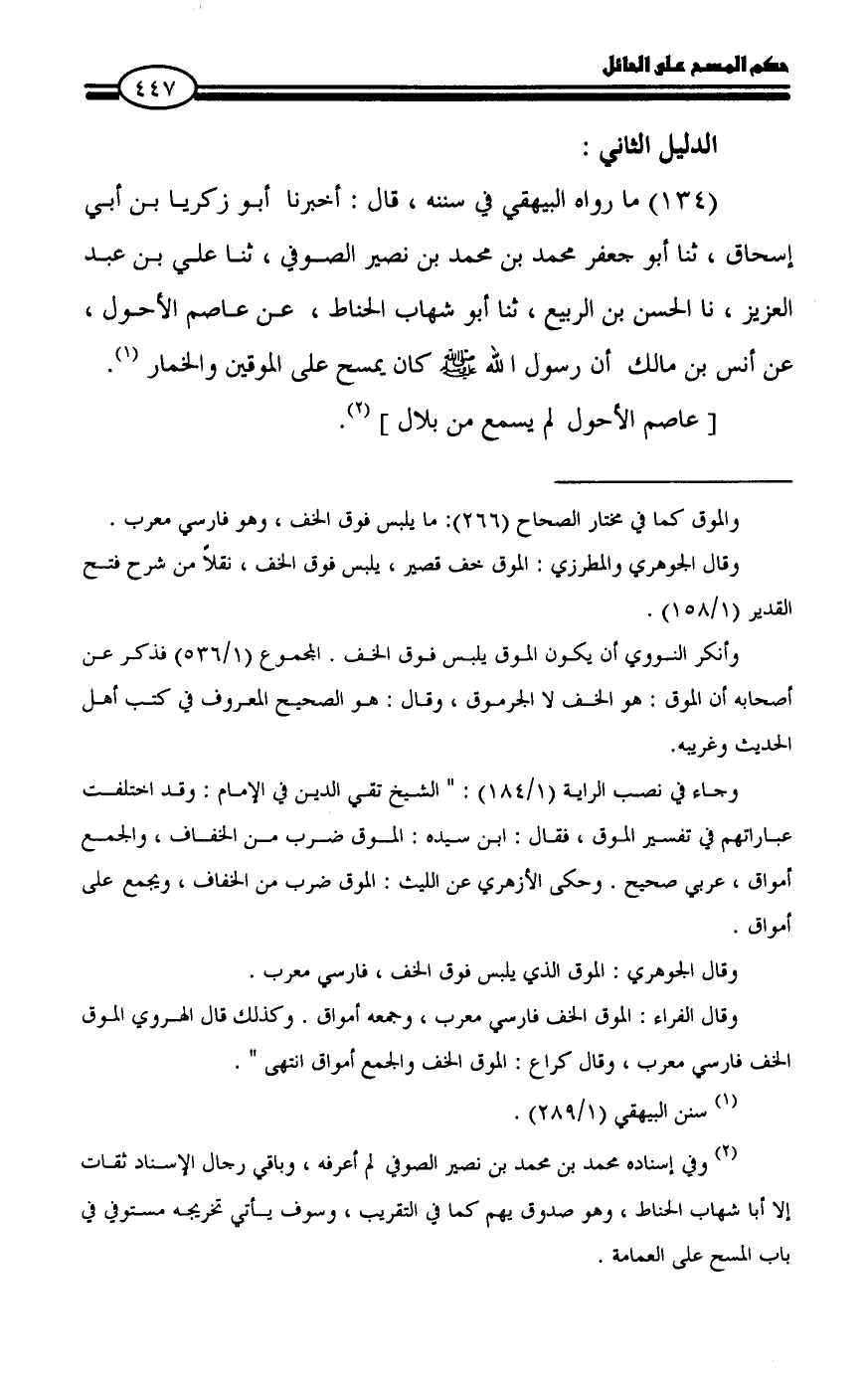 (134) ما رواه البيهقي في سننه، قال: أخبرنا أبو زكريا بن أبي إسحاق، ثنا أبو جعفر محمد بن محمد بن نصير الصوفي، ثنا علي بن عبد العزيز، نا الحسن بن الربيع، ثنا أبو شهاب الحناط، عن عاصم الأحول، عن أنس بن مالك أن رسول الله - صلى الله عليه وسلم - كان يمسح على الموقين والخمار (¬1).