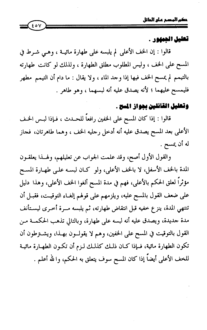 والقول الأول أصح، وقد علمت الجواب عن تعليلهم، ولهذا يعلقون المدة بالخف الأسفل، لا بالخف الأعلى، ولو كان لبسه على طهارة المسح مؤثراً لعلق الحكم بالأعلى، فهم في مدة المسح ألغوا الخف الأعلى، وهذا دليل على ضعف القول بالمسح عليه، ويلزمهم على قولهم إلغاء التوقيت، فقبل أن تنتهي المدة، ينزع خفيه قبل انتقاض طهارته، ثم يلبسه مرة أخرى ليستأنف مدة جديدة، ويصدق عليه أنه لبسه على طهارة، وبالتالي تذهب الحكمة من القول بالتوقيت في المسح على الخفين، وهم لا يقولون بهذا، ويشترطون أن تكون الطهارة مائية، فإذا كان ذلك كذلك لزم أن تكون الطهارة مائية للخف الأعلى أيضاً إذا كان المسح سوف يتعلق به الحكم، والله أعلم.