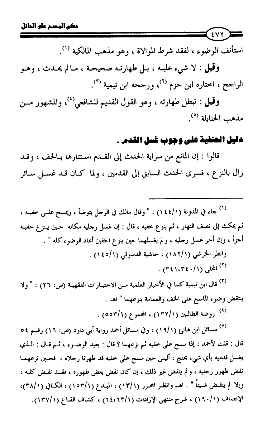 (¬5) مسائل ابن هانئ (1/ 19)، وفي مسائل أحمد رواية أبي داود (ص: 16) رقم 54 قال: قلت لأحمد: إذا مسح على خفيه ثم نزعهما؟ قال: يعيد الوضوء، ثم قال: الذي يغسل قدميه بأي شيء يحتج، أليس حين مسح على خفيه قد طهرتا رجلاه، فحين نزعهما نقض طهور رجليه، ولم ينقض غير ذلك، إن كان نقض بعض طهوره، فقد نقض كله، وإلا لم ينقض شيئاً ". اهـ وانظر المحرر (1/ 13)، المبدع (1/ 153)، الكافي (1/ 38)، الإنصاف (1/ 190)، شرح منتهى الإرادات (1/ 63،64)، كشاف القناع (1/ 137).