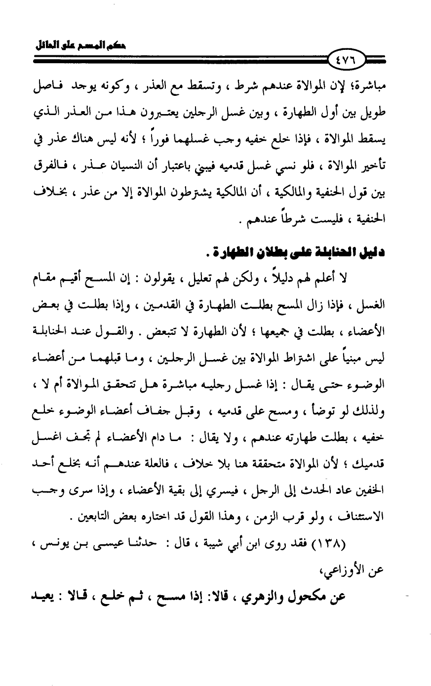 لا أعلم لهم دليلاً، ولكن لهم تعليل، يقولون: إن المسح أقيم مقام الغسل، فإذا زال المسح بطلت الطهارة في القدمين، وإذا بطلت في بعض الأعضاء، بطلت في جميعها؛ لأن الطهارة لا تتبعض. والقول عند الحنابلة ليس مبنياً على اشتراط الموالاة بين غسل الرجلين، وما قبلهما من أعضاء الوضوء حتى يقال: إذا غسل رجليه مباشرة هل تتحقق الموالاة أم لا، ولذلك لو توضأ، ومسح على قدميه، وقبل جفاف أعضاء الوضوء خلع خفيه، بطلت طهارته عندهم، ولا يقال: ما دام الأعضاء لم تجف اغسل قدميك؛ لأن الموالاة متحققة هنا بلا خلاف، فالعلة عندهم أنه بخلع أحد الخفين عاد الحدث إلى الرجل، فيسري إلى بقية الأعضاء، وإذا سرى وجب الاستئناف، ولو قرب الزمن، وهذا القول قد اختاره بعض التابعين.