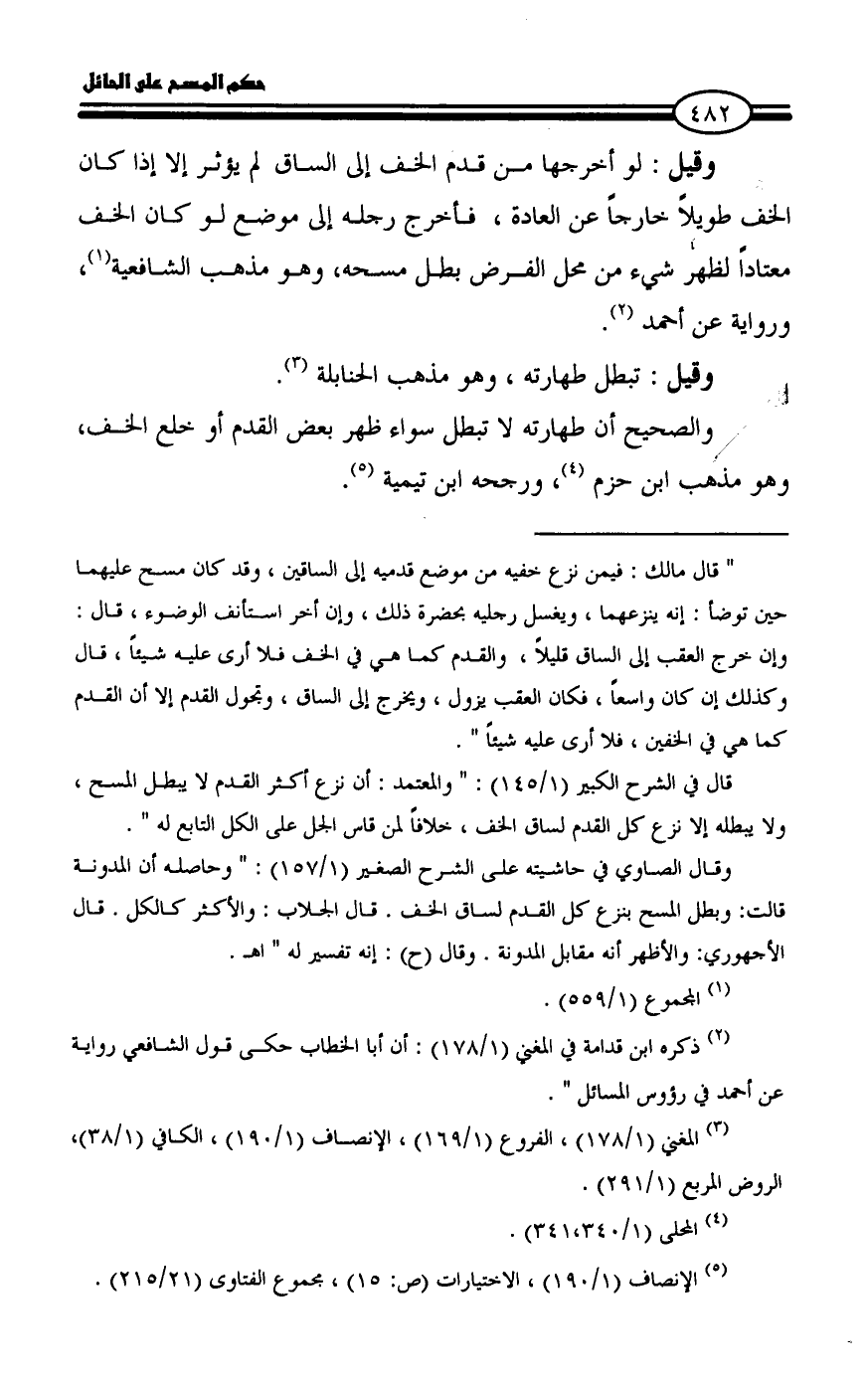 وقال الصاوي في حاشيته على الشرح الصغير (1/ 157): " وحاصله أن المدونة قالت: وبطل المسح بنزع كل القدم لساق الخف. قال الجلاب: والأكثر كالكل. قال الأجهوري: والأظهر أنه مقابل المدونة. وقال (ح): إنه تفسير له " اهـ.