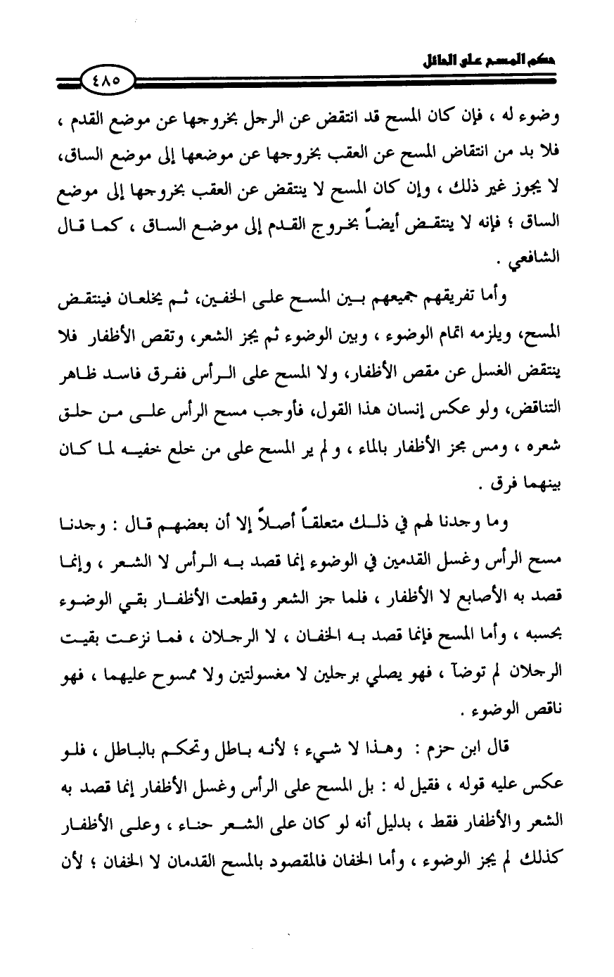 وأما تفريقهم جميعهم بين المسح على الخفين، ثم يخلعان فينتقض المسح، ويلزمه اتمام الوضوء، وبين الوضوء ثم يجز الشعر، وتقص الأظفار فلا ينتقض الغسل عن مقص الأظفار، ولا المسح على الرأس ففرق فاسد ظاهر التناقض، ولو عكس إنسان هذا القول، فأوجب مسح الرأس على من حلق شعره، ومس مجز الأظفار بالماء، ولم ير المسح على من خلع خفيه لما كان بينهما فرق.