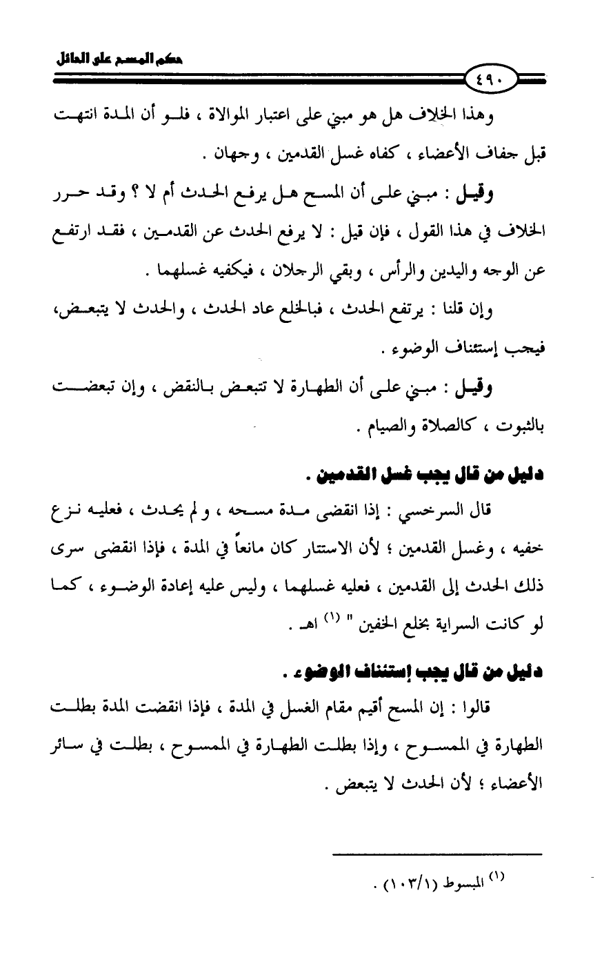 قال السرخسي: إذا انقضى مدة مسحه، ولم يحدث، فعليه نزع خفيه، وغسل القدمين؛ لأن الاستتار كان مانعاً في المدة، فإذا انقضى سرى ذلك الحدث إلى القدمين، فعليه غسلهما، وليس عليه إعادة الوضوء، كما لو كانت السراية بخلع الخفين " (¬1) اهـ.