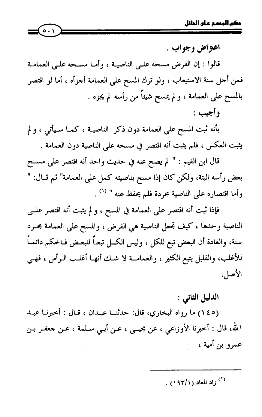 فإذا ثبت أنه اقتصر على العمامة في المسح، ولم يثبت أنه اقتصر على الناصية وحدها، كيف تجعل الناصية هي الفرض، والمسح على العمامة مجرد سنة، والعادة أن البعض تبع للكل، وليس الكل تبعاً للبعض فالحكم دائماً للأغلب، والقليل يتبع الكثير، والعمامة لا شك أنها أغلب الرأس، فهي الأصل.
