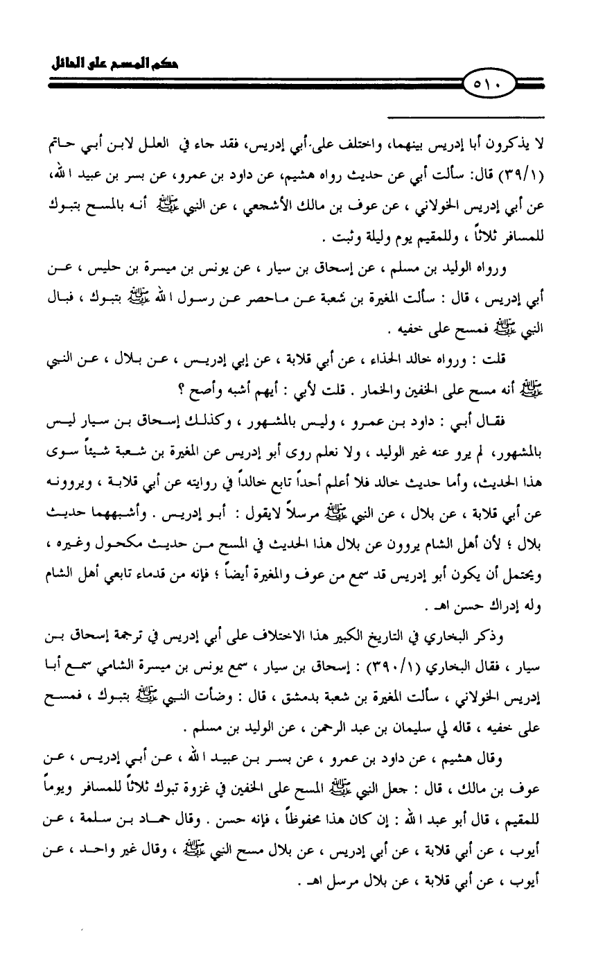 فقال أبي: داود بن عمرو، وليس بالمشهور، وكذلك إسحاق بن سيار ليس بالمشهور، لم يرو عنه غير الوليد، ولا نعلم روى أبو إدريس عن المغيرة بن شعبة شيئاً سوى هذا الحديث، وأما حديث خالد فلا أعلم أحداً تابع خالداً في روايته عن أبي قلابة، ويروونه عن أبي قلابة، عن بلال، عن النبي - صلى الله عليه وسلم - مرسلاً لايقول: أبو إدريس. وأشبههما حديث بلال؛ لأن أهل الشام يروون عن بلال هذا الحديث في المسح من حديث مكحول وغيره، ويحتمل أن يكون أبو إدريس قد سمع من عوف والمغيرة أيضاً؛ فإنه من قدماء تابعي أهل الشام وله إدراك حسن اهـ.