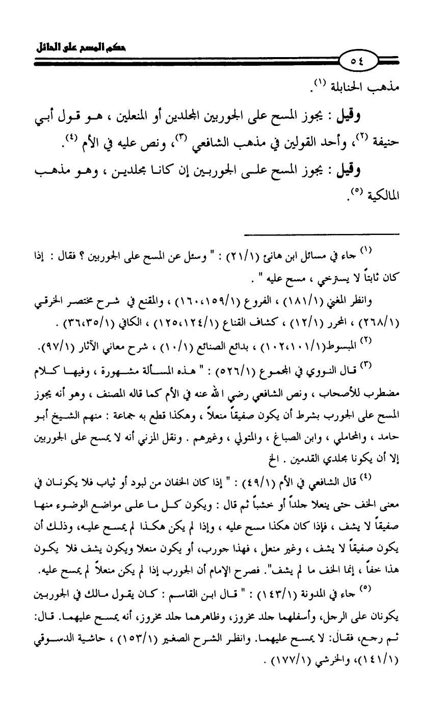 (¬5) جاء في المدونة (1/ 143): " قال ابن القاسم: كان يقول مالك في الجوربين يكونان على الرجل، وأسفلهما جلد مخروز، وظاهرهما جلد مخروز، أنه يمسح عليهما. قال: ثم رجع، فقال: لا يمسح عليهما. وانظر الشرح الصغير (1/ 153)، حاشية الدسوقي (1/ 141)، والخرشي (1/ 177).