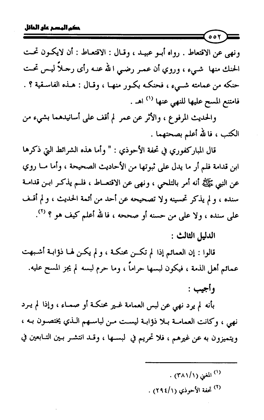 ونهى عن الاقتعاط. رواه أبو عبيد، وقال: الاقتعاط: أن لايكون تحت الحنك منها شيء، وروي أن عمر رضي الله عنه رأى رجلاً ليس تحت حنكه من عمامته شيء، فحنكه بكور منها، وقال: هذه الفاسقية؟. فامتنع المسح عليها للنهي عنها (¬1) اهـ.