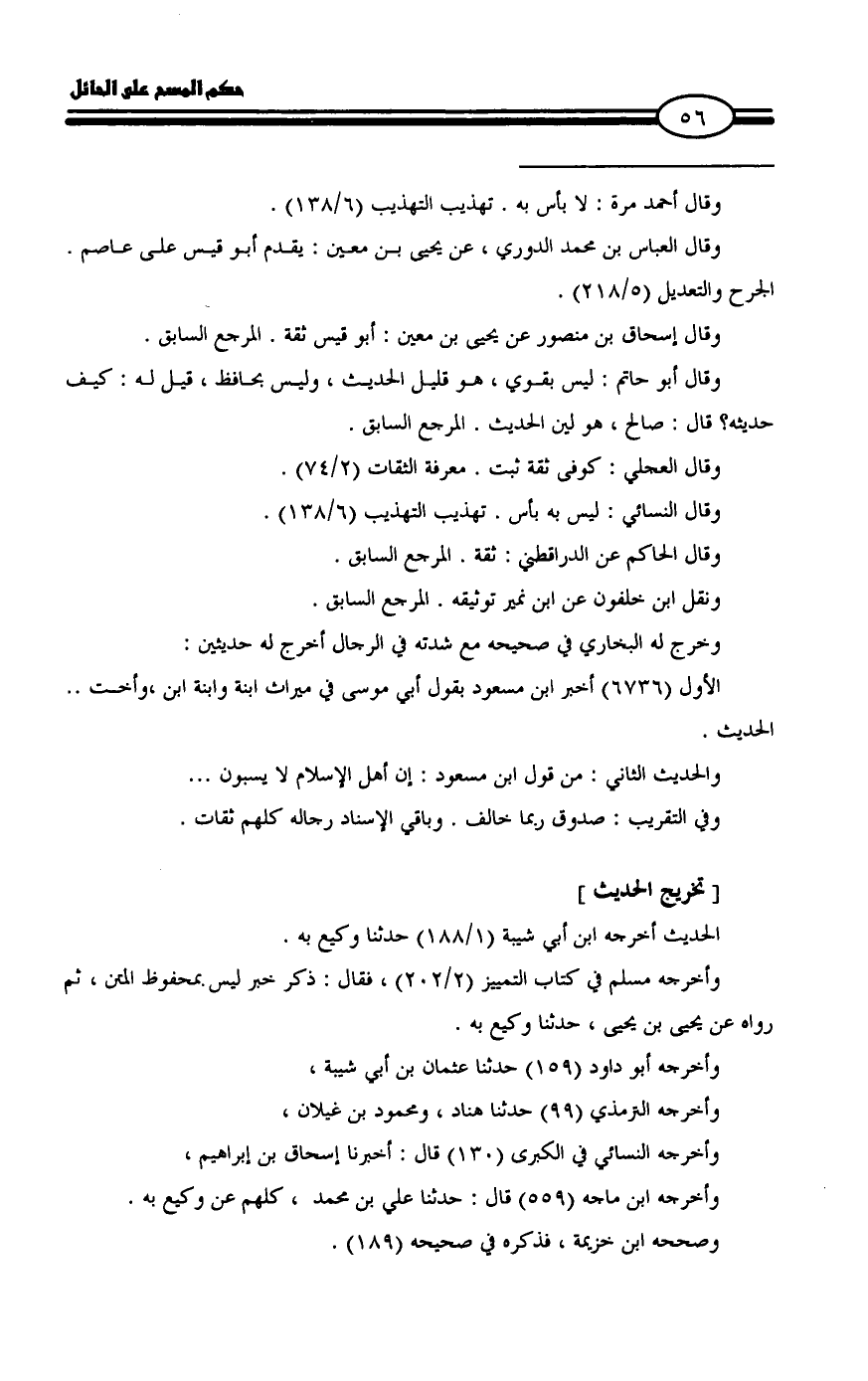 وقال النسائي: ليس به بأس. تهذيب التهذيب (6/ 138).