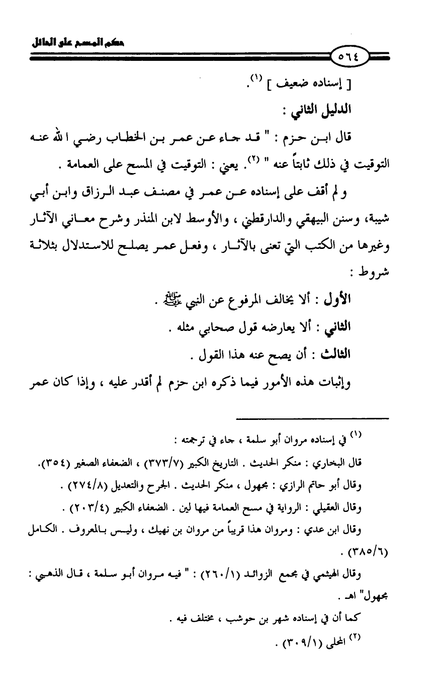 قال ابن حزم: " قد جاء عن عمر بن الخطاب رضي الله عنه التوقيت في ذلك ثابتاً عنه " (¬2). يعني: التوقيت في المسح على العمامة.