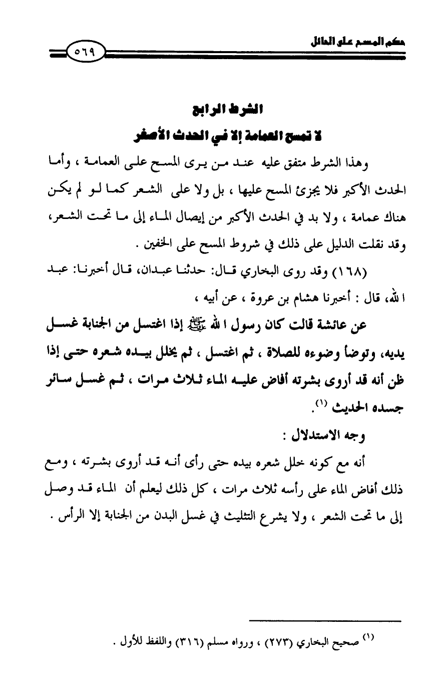 وهذا الشرط متفق عليه عند من يرى المسح على العمامة، وأما الحدث الأكبر فلا يجزئ المسح عليها، بل ولا على الشعر كما لو لم يكن هناك عمامة، ولا بد في الحدث الأكبر من إيصال الماء إلى ما تحت الشعر، وقد نقلت الدليل على ذلك في شروط المسح على الخفين.