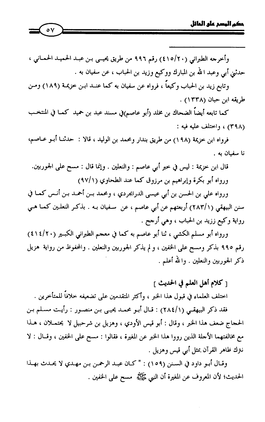 وقال أبو داود في السنن (159): " كان عبد الرحمن بن مهدي لا يحدث بهذا الحديث؛ لأن المعروف عن المغيرة أن النبي - صلى الله عليه وسلم - مسح على الخفين. =