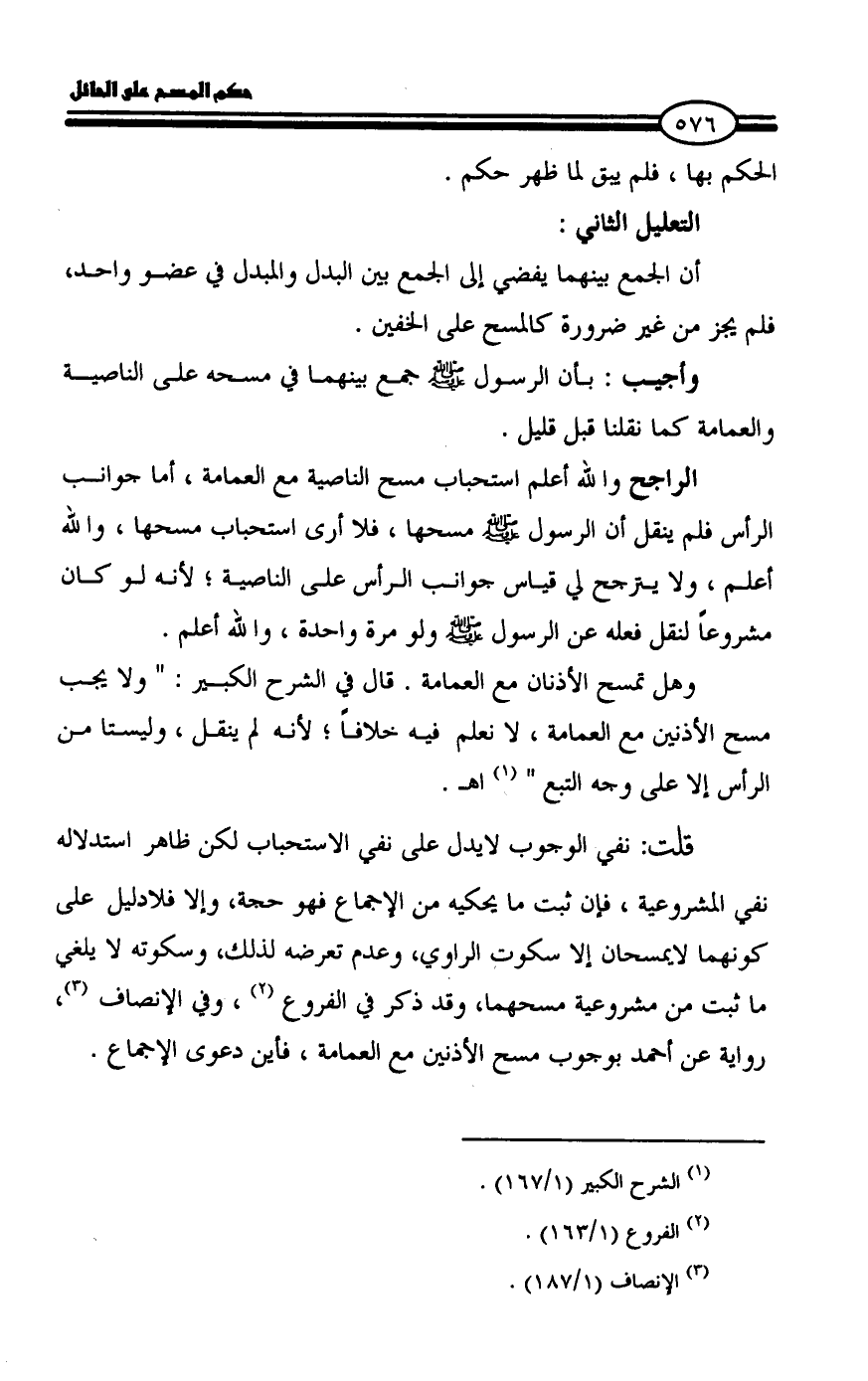 وأجيب: بأن الرسول - صلى الله عليه وسلم - جمع بينهما في مسحه على الناصية والعمامة كما نقلنا قبل قليل.