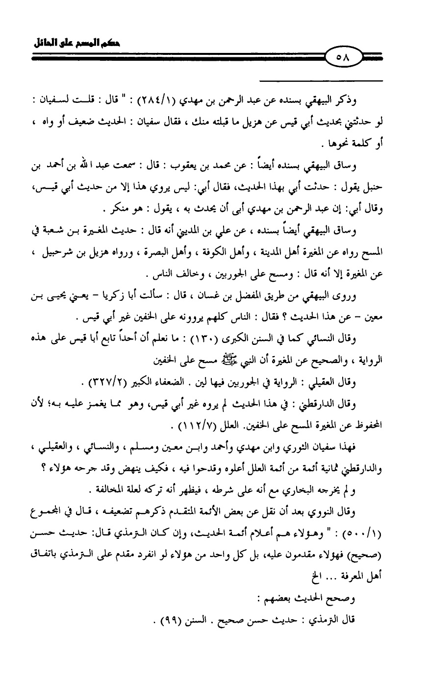 وقال النسائي كما في السنن الكبرى (130): ما نعلم أن أحداً تابع أبا قيس على هذه الرواية، والصحيح عن المغيرة أن النبي - صلى الله عليه وسلم - مسح على الخفين