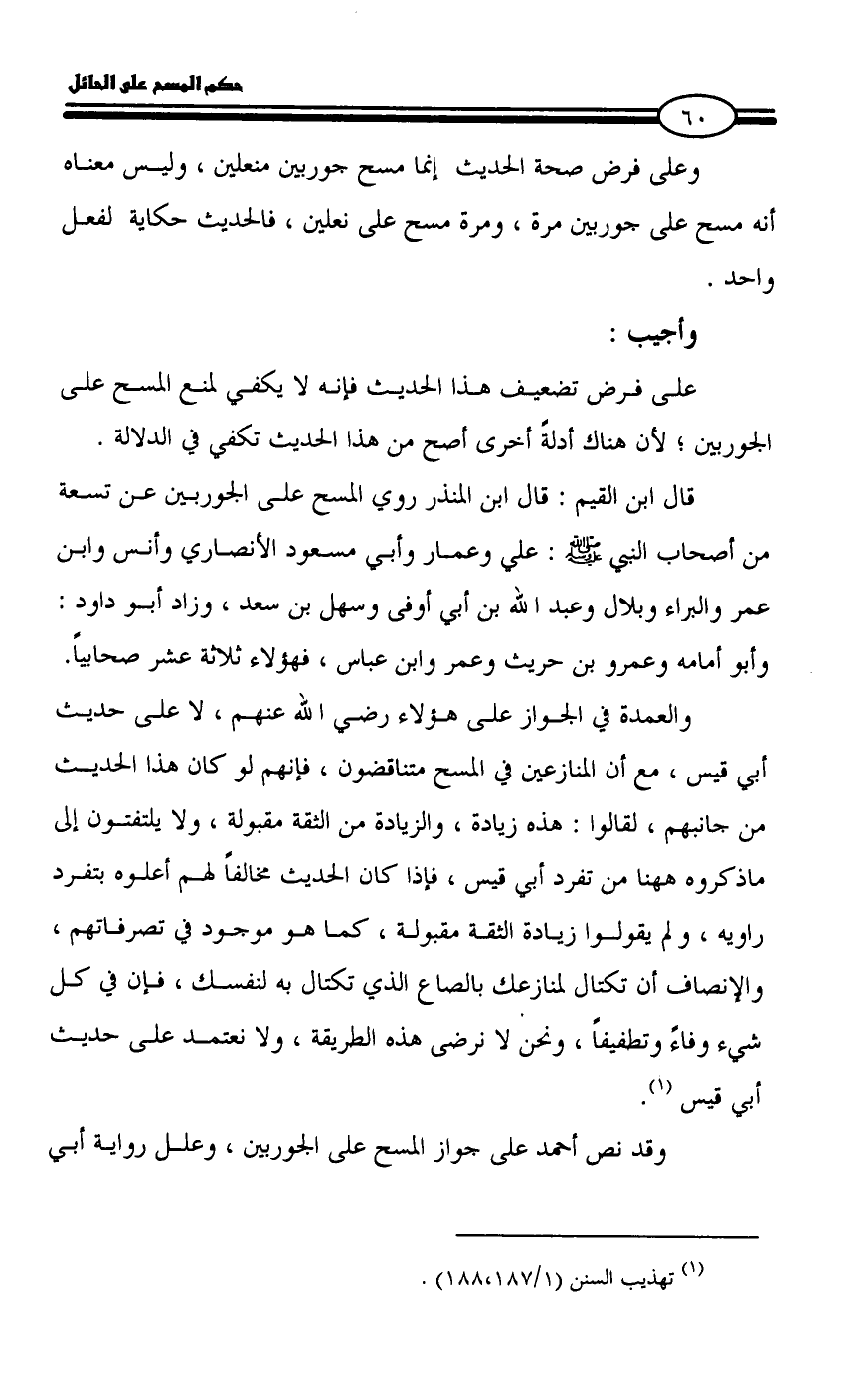 أبي قيس، مع أن المنازعين في المسح متناقضون، فإنهم لو كان هذا الحديث من جانبهم، لقالوا: هذه زيادة، والزيادة من الثقة مقبولة، ولا يلتفتون إلى ماذكروه ههنا من تفرد أبي قيس، فإذا كان الحديث مخالفاً لهم أعلوه بتفرد راويه، ولم يقولوا زيادة الثقة مقبولة، كما هو موجود في تصرفاتهم، والإنصاف أن تكتال لمنازعك بالصاع الذي تكتال به لنفسك، فإن في كل شيء وفاءً وتطفيفاً، ونحن لا نرضى هذه الطريقة، ولا نعتمد على حديث أبي قيس (¬1).