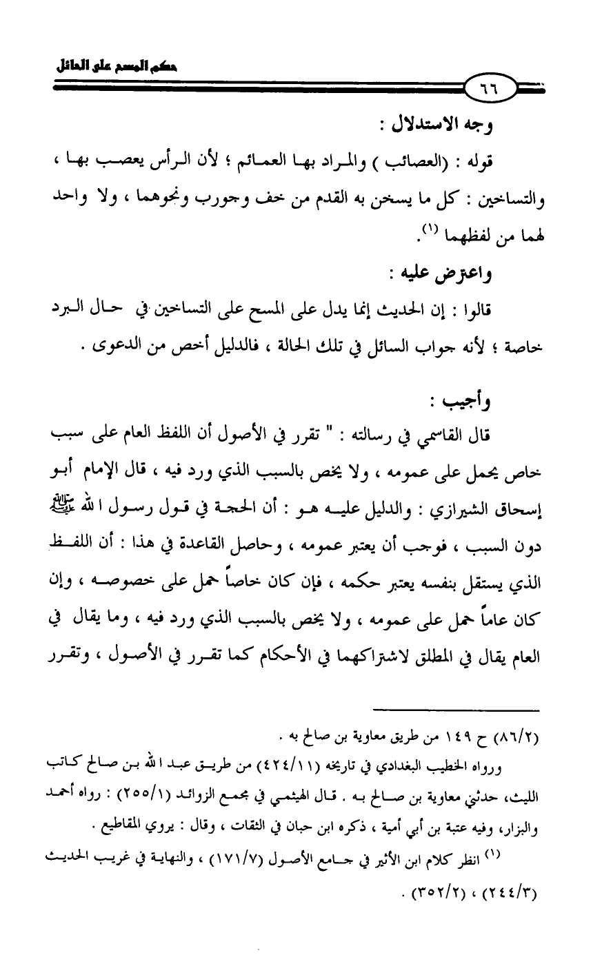 قالوا: إن الحديث إنما يدل على المسح على التساخين في حال البرد خاصة؛ لأنه جواب السائل في تلك الحالة، فالدليل أخص من الدعوى.