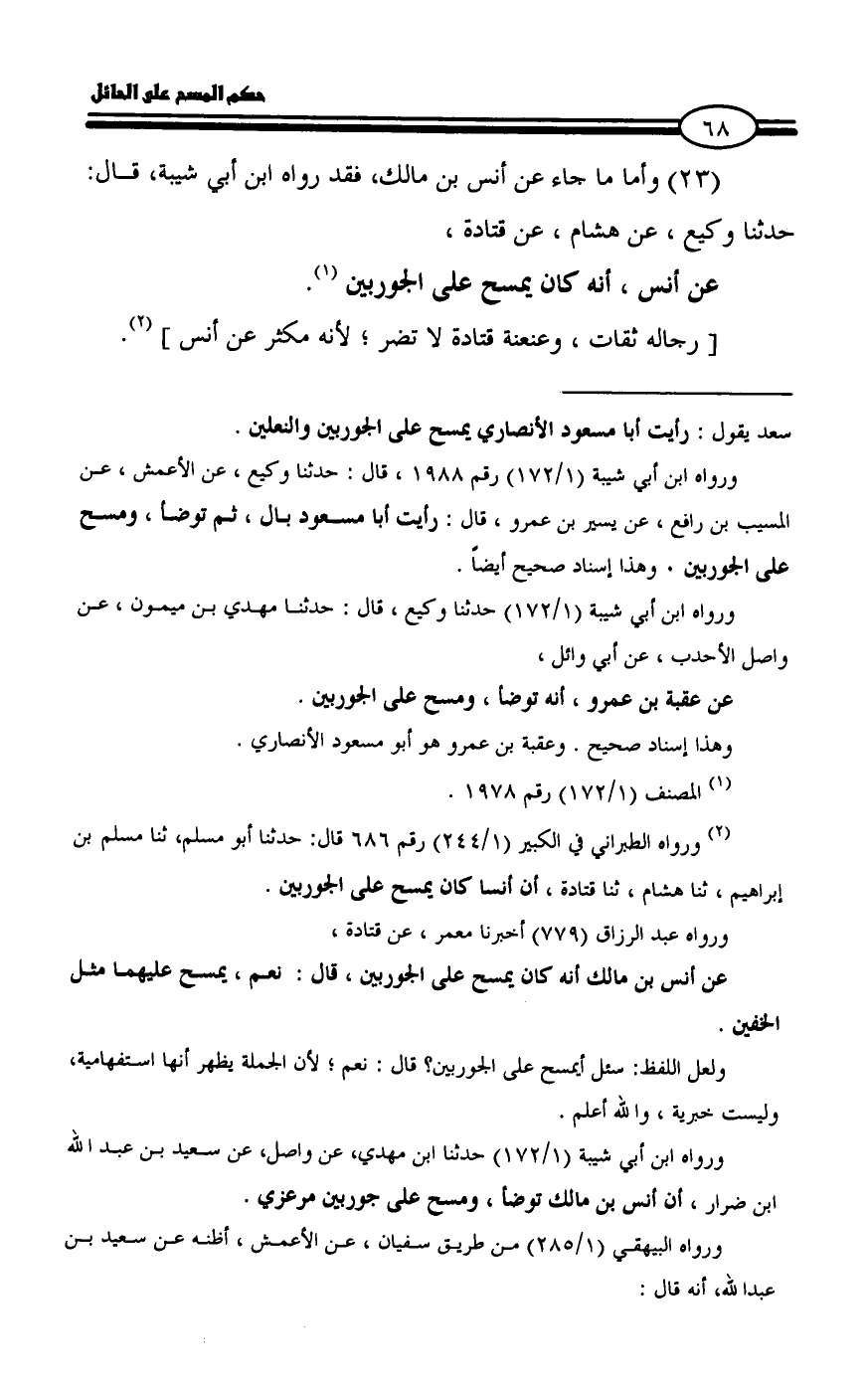 (¬2) ورواه الطبراني في الكبير (1/ 244) رقم 686 قال: حدثنا أبو مسلم، ثنا مسلم بن إبراهيم، ثنا هشام، ثنا قتادة، أن أنسا كان يمسح على الجوربين.