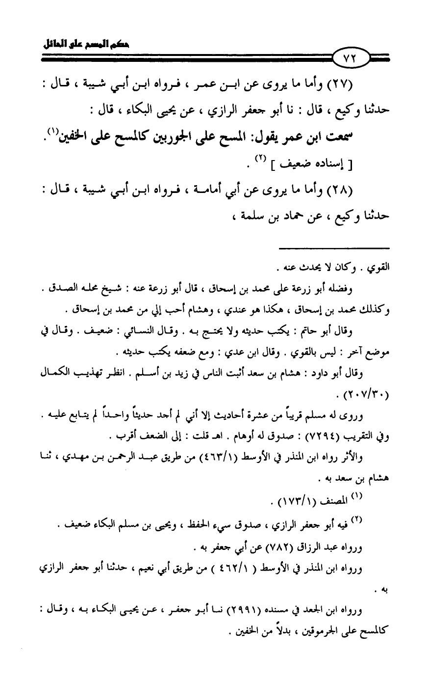 (27) وأما ما يروى عن ابن عمر، فرواه ابن أبي شيبة، قال: حدثنا وكيع، قال: نا أبو جعفر الرازي، عن يحيى البكاء، قال: