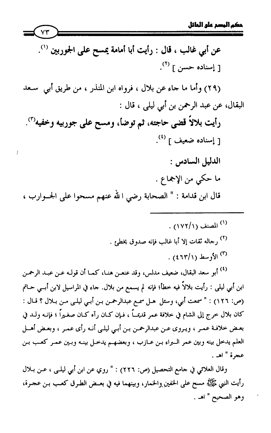 وقال العلائي في جامع التحصيل (ص: 226): " روي عن ابن أبي ليلى، عن بلال رأيت النبي - صلى الله عليه وسلم - مسح على الخفين والخمار، وبينهما فيه في بعض الطرق كعب بن عجرة، وهو الصحيح " اهـ.