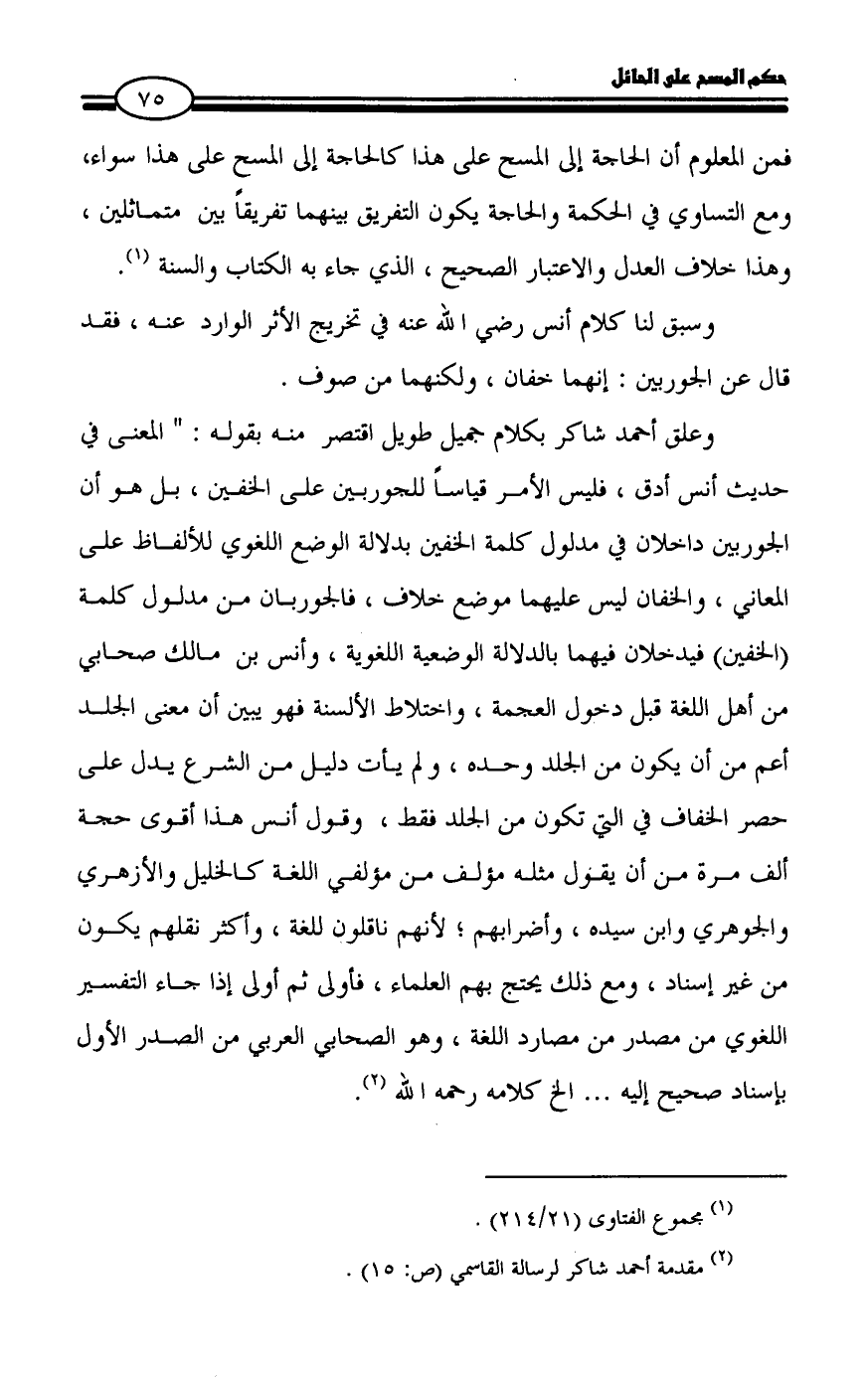 وعلق أحمد شاكر بكلام جميل طويل اقتصر منه بقوله: " المعنى في حديث أنس أدق، فليس الأمر قياساً للجوربين على الخفين، بل هو أن الجوربين داخلان في مدلول كلمة الخفين بدلالة الوضع اللغوي للألفاظ على المعاني، والخفان ليس عليهما موضع خلاف، فالجوربان من مدلول كلمة (الخفين) فيدخلان فيهما بالدلالة الوضعية اللغوية، وأنس بن مالك صحابي من أهل اللغة قبل دخول العجمة، واختلاط الألسنة فهو يبين أن معنى الجلد أعم من أن يكون من الجلد وحده، ولم يأت دليل من الشرع يدل على حصر الخفاف في التي تكون من الجلد فقط، وقول أنس هذا أقوى حجة ألف مرة من أن يقول مثله مؤلف من مؤلفي اللغة كالخليل والأزهري والجوهري وابن سيده، وأضرابهم؛ لأنهم ناقلون للغة، وأكثر نقلهم يكون من غير إسناد، ومع ذلك يحتج بهم العلماء، فأولى ثم أولى إذا جاء التفسير اللغوي من مصدر من مصارد اللغة، وهو الصحابي العربي من الصدر الأول بإسناد صحيح إليه ... الخ كلامه رحمه الله (¬2).