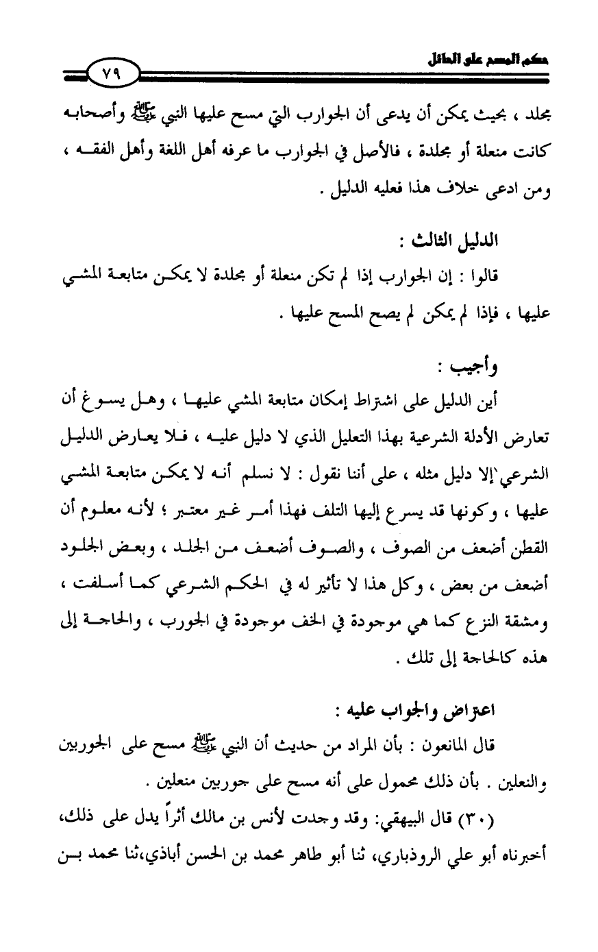 مجلد، بحيث يمكن أن يدعى أن الجوارب التي مسح عليها النبي - صلى الله عليه وسلم - وأصحابه كانت منعلة أو مجلدة، فالأصل في الجوارب ما عرفه أهل اللغة وأهل الفقه، ومن ادعى خلاف هذا فعليه الدليل.