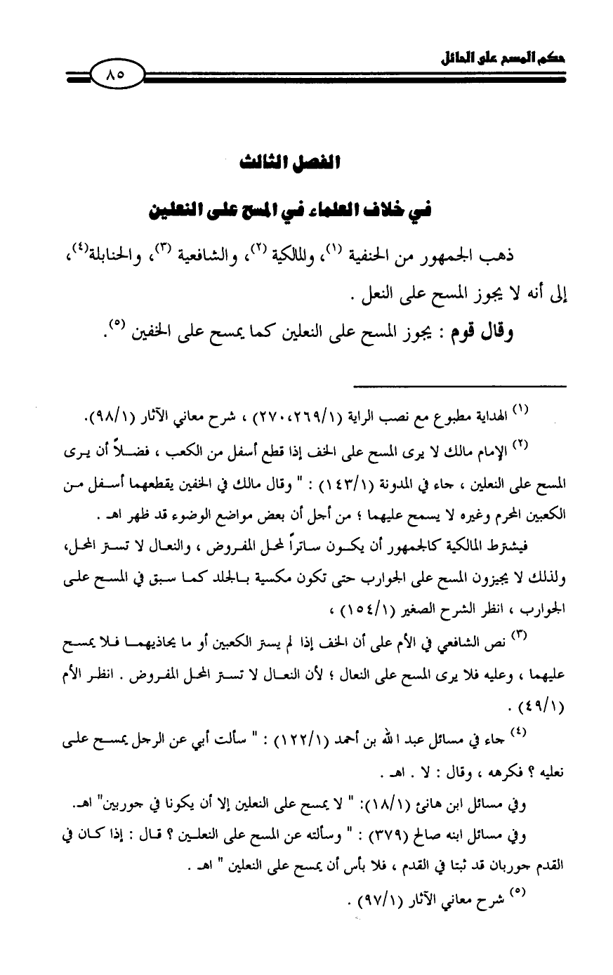 (¬3) نص الشافعي في الأم على أن الخف إذا لم يستر الكعبين أو ما يحاذيهما فلا يمسح عليهما، وعليه فلا يرى المسح على النعال؛ لأن النعال لا تستر المحل المفروض. انظر الأم (1/ 49).