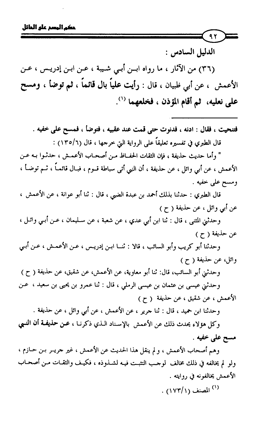 (36) من الآثار، ما رواه ابن أبي شيبة، عن ابن إدريس، عن الأعمش، عن أبي ظبيان، قال: رأيت علياً بال قائماً، ثم توضأ، ومسح على نعليه، ثم أقام المؤذن، فخلعهما (¬1).