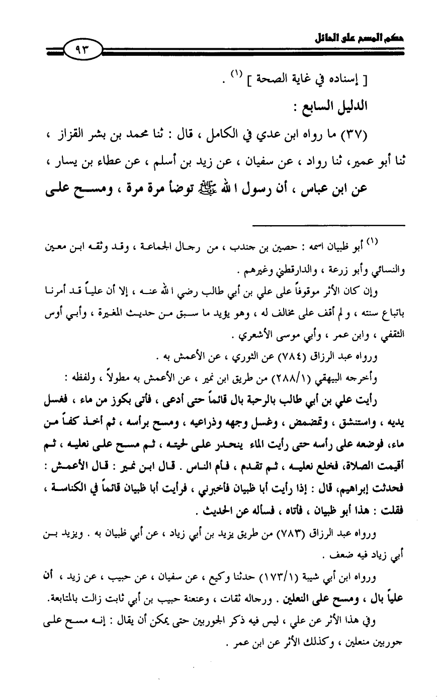 رأيت علي بن أبي طالب بالرحبة بال قائماً حتى أدعى، فأتى بكوز من ماء، فغسل يديه، واستنشق، وتمضمض، وغسل وجهه وذراعيه، ومسح برأسه، ثم أخذ كفاً من ماء، فوضعه على رأسه حتى رأيت الماء ينحدر على لحيته، ثم مسح على نعليه، ثم أقيمت الصلاة، فخلع نعليه، ثم تقدم، فأم الناس. قال ابن نمير: قال الأعمش: فحدثت إبراهيم، قال: إذا رأيت أبا ظبيان فأخبرني، فرأيت أبا ظبيان قائماً في الكناسة، فقلت: هذا أبو ظبيان، فأتاه، فسأله عن الحديث.