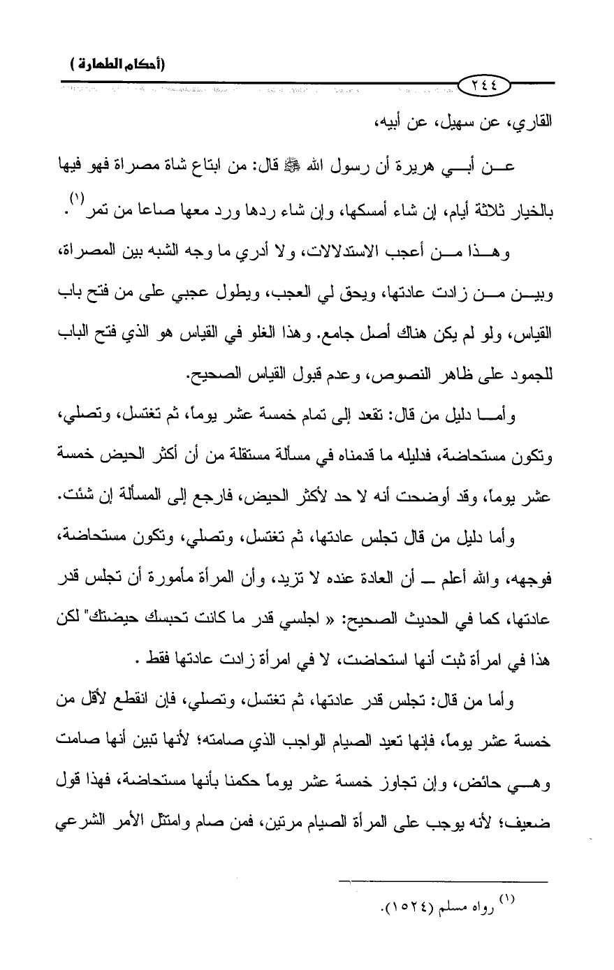 وهذا من أعجب الاستدلالات، ولا أدري ما وجه الشبه بين المصراة، وبين من زادت عادتها، ويحق في العجب، ويطول عجبي على من فتح باب القياس، ولو لم يكن هناك أصل جامع. وهذا الغلو في القياس هو الذي فتح الباب للجمود على ظاهر النصوص، وعدم قبول القياس الصحيح.