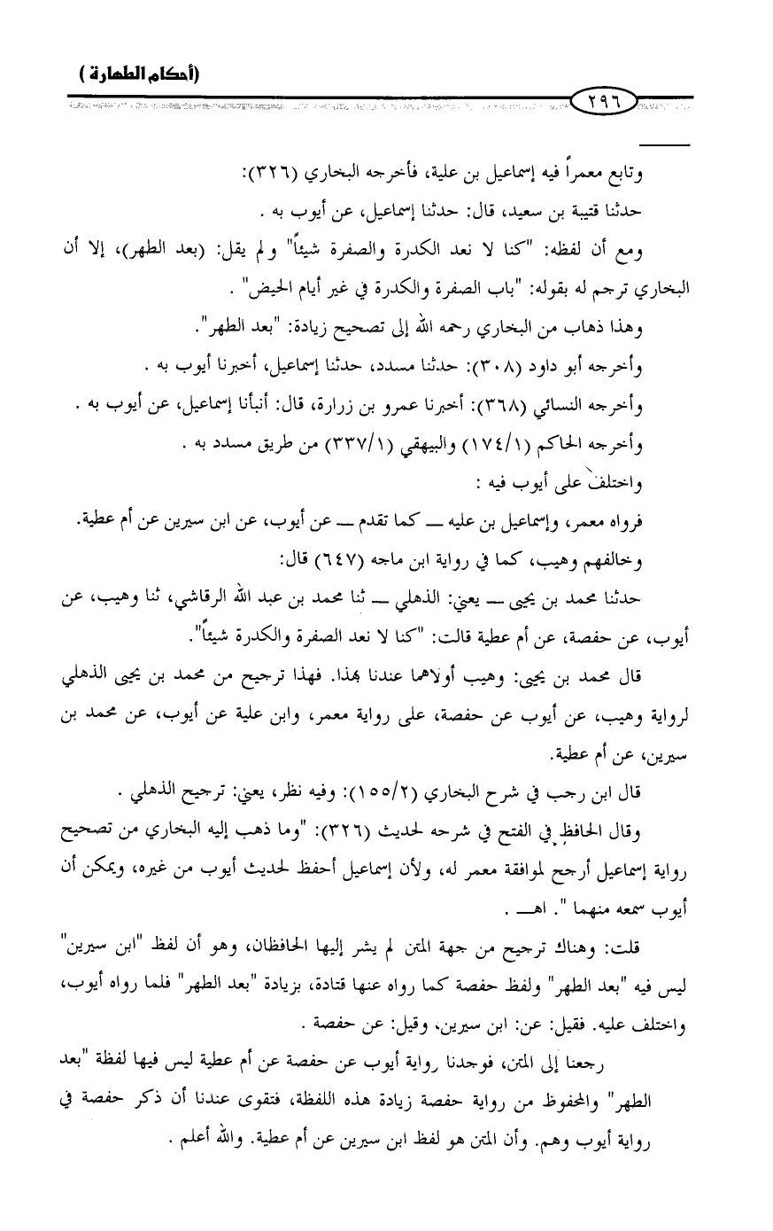 قلت: وهناك ترجيح من جهة المتن لم يشر إليها الحافظان، وهو أن لفظ "ابن سيرين" ليس فيه "بعد الطهر" ولفظ حفصة كما رواه عنها قتادة، بزيادة "بعد الطهر" فلما رواه أيوب، واختلف عليه. فقيل: عن: ابن سيرين، وقيل: عن حفصة.