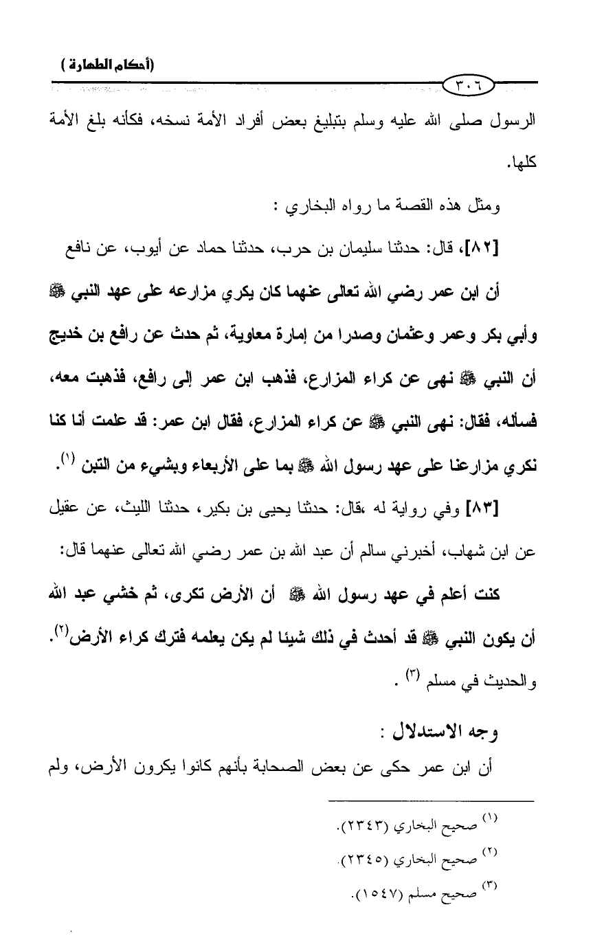 [82] , قال: حدثنا سليمان بن حرب، حدثنا حماد عن أيوب، عن نافع أن ابن عمر رضي الله تعالى عنهما كان يكري مزارعه على عهد النبي - صلى الله عليه وسلم - وأبي بكر وعمر وعثمان وصدرا من إمارة معاوية، ثم حدث عن رافع بن خديج أن النبي - صلى الله عليه وسلم - نهى عن كراء المزارع، فذهب ابن عمر إلى رافع، فذهبت معه، فسأله، فقال: نهى النبي - صلى الله عليه وسلم - عن كراء المزارع، فقال ابن عمر: قد علمت أنا كنا نكري مزارعنا على عهد رسول الله - صلى الله عليه وسلم - بما على الأربعاء وبشيء من التبن (¬1).