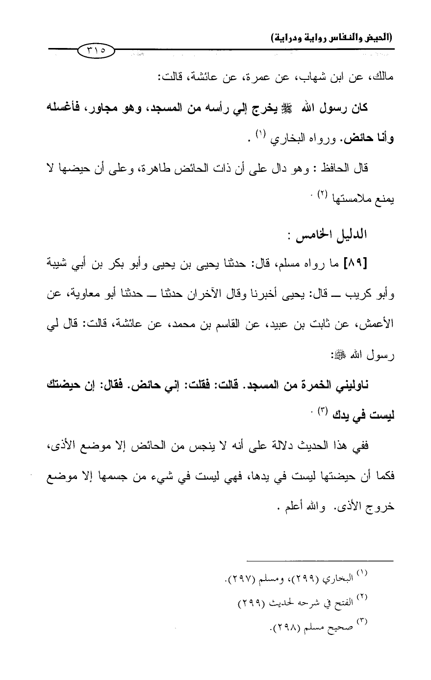 ناوليني الخمرة من المسجد. قالت: فقلت: إني حائض. فقال: إن حيضتك ليست في يدك (¬3)
