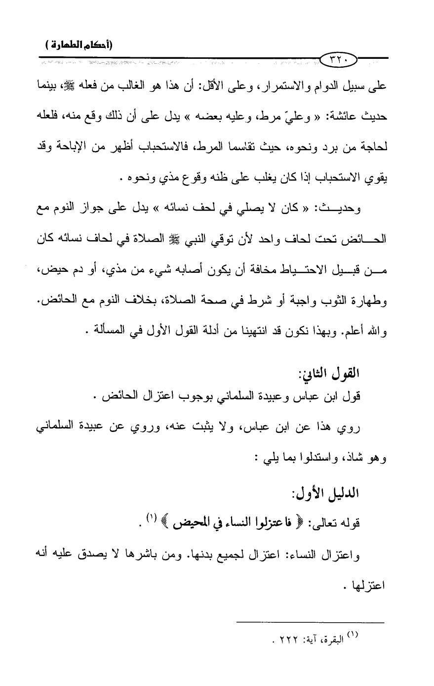 وحديث: "كان لا يصلي في لحف نسائه" يدل على جواز النوم مع الحائض تحت لحاف واحد لأن توقي النبي - صلى الله عليه وسلم - الصلاة في لحاف نسائه كان من قبيل الاحتياط مخافة أن يكون أصابه شيء من مذي، أو دم حيض، وطهارة الثوب واجبة أو شرط في صحة الصلاة، بخلاف النوم مع الحائض. والله أعلم. وبهذا نكون قد انتهينا من أدلة القول الأول في المسألة.