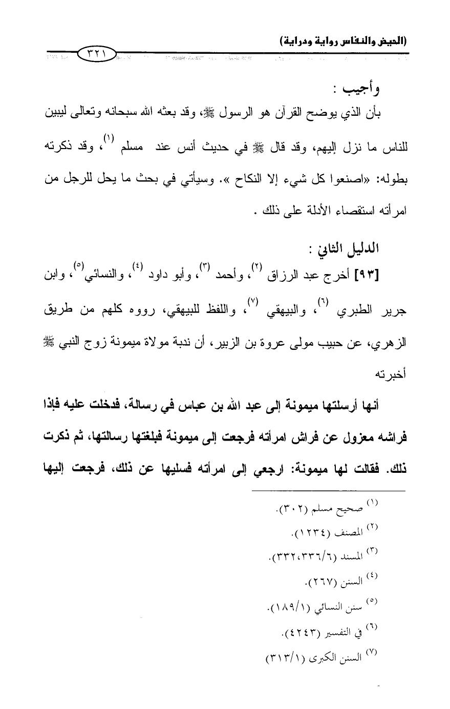 [93] أخرج عبد الرزاق (¬2)، وأحمد (¬3)، وأبو داود (¬4)، والنسائي (¬5)، وابن جرير الطبري (¬6)، والبيهقي (¬7)، واللفظ للبيهقي، رووه كلهم من طريق الزهري، عن حبيب مولى عروة بن الزبير، أن ندبة مولاة ميمونة زوج النبي - صلى الله عليه وسلم - أخبرته
