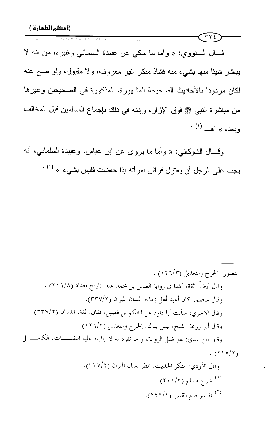 قال النووي: "وأما ما حكي عن عبيدة السلماني وغيره، من أنه لا يباشر شيئاً منها بشيء منه فشاذ منكر غير معروف، ولا مقبول، ولو صح عنه لكان مردوداً بالأحاديث الصحيحة المشهورة، المذكورة فى الصحيحين وغيرها من مباشرة النبي - صلى الله عليه وسلم - فوق الإزار، وإذنه في ذلك بإجماع المسلمين قبل المخالف وبعده" اهـ (¬1).