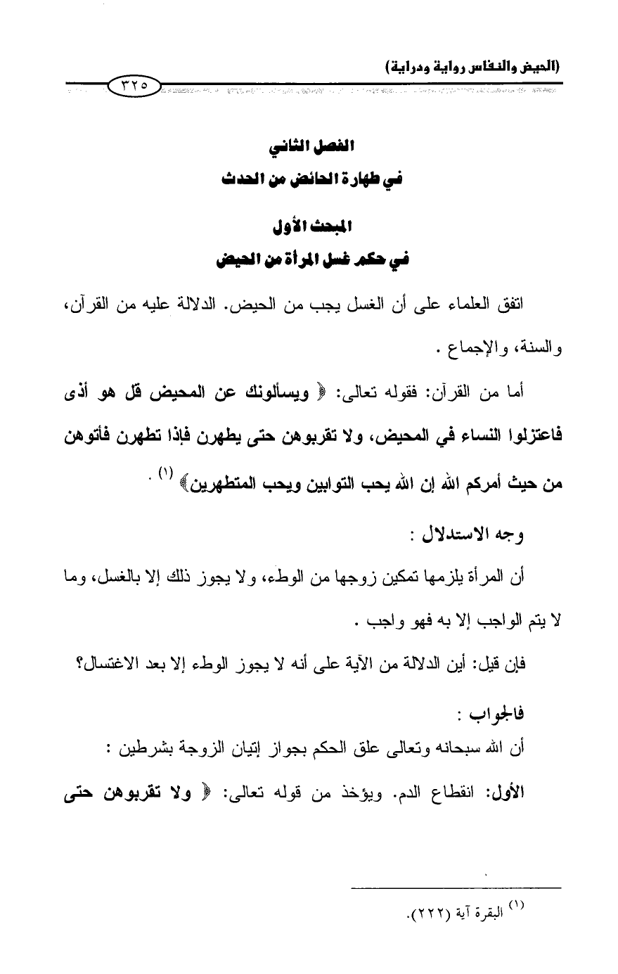 أما من القرآن: فقوله تعالى: {وَيَسْأَلُونَكَ عَنِ الْمَحِيضِ قُلْ هُوَ أَذًى فَاعْتَزِلُوا النِّسَاءَ فِي الْمَحِيضِ وَلَا تَقْرَبُوهُنَّ حَتَّى يَطْهُرْنَ فَإِذَا تَطَهَّرْنَ فَأْتُوهُنَّ مِنْ حَيْثُ أَمَرَكُمُ اللَّهُ إِنَّ اللَّهَ يُحِبُّ التَّوَّابِينَ وَيُحِبُّ الْمُتَطَهِّرِينَ} (¬1)