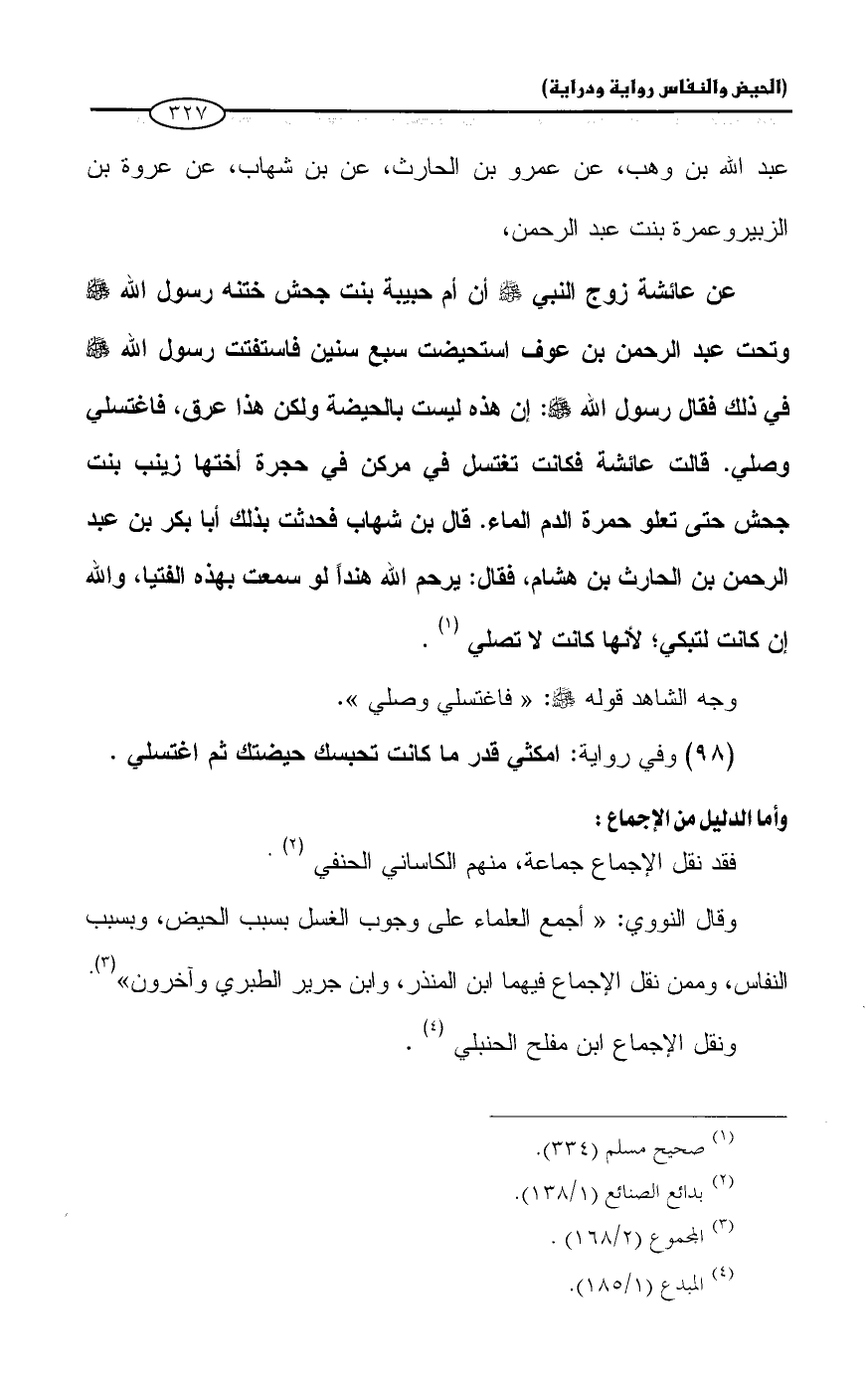 عن عائشة زوج النبي - صلى الله عليه وسلم - أن أم حبيبة بنت جحش ختنه رسول الله - صلى الله عليه وسلم - وتحت عبد الرحمن بن عوف استحيضت سبع سنين فاستفتت رسول الله - صلى الله عليه وسلم - في ذلك فقال رسول الله - صلى الله عليه وسلم -: إن هذه ليست بالحيضة ولكن هذا عرق، فاغتسلي وصلي. قالت عائشة فكانت تغتسل في مركن في حجرة أختها زينب بنت جحش حتى تعلو حمرة الدم الماء. قال بن شهاب فحدثت بذلك أبا بكر بن عبد الرحمن بن الحارث بن هشام، فقال: يرحم الله هنداً لو سمعت بهذه الفتيا، والله إن كانت لتبكي؛ لأنها كانت لا تصلي (¬1).