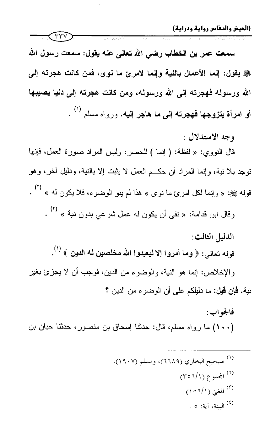سمعت عمر بن الخطاب رضي الله تعالى عنه يقول: سمعت رسول الله - صلى الله عليه وسلم - يقول: إنما الأعمال بالنية وإنما لامرئ ما نوى، فمن كانت هجرته إلى الله ورسوله فهجرته إلى الله ورسوله، ومن كانت هجرته إلى دنيا يصيبها أو امرأة يتزوجها فهجرته إلى ما هاجر إليه. ورواه مسلم (¬1).