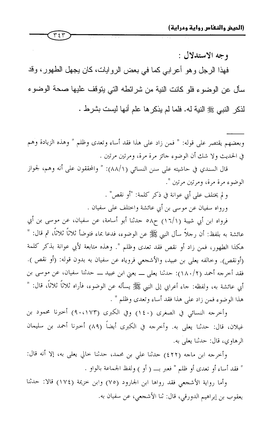 فرواه ابن أبي شيبة (1/ 16) ح 58 حدثنا أبو أسامة، عن سفيان، عن موسى بن أبي عائشة به بلفظ: أن رجلاً سأل النبي - صلى الله عليه وسلم - عن الوضوء، فدعا بماء فتوضأ ثلاثاً ثلاثاً، ثم قال: "هكذا الطهور، فمن زاد أو نقص فقد تعدى وظلم". وهذه متابعة لأبي عوانة بذكر كلمة (أو نقص). وخالفه يعلى بن عبيد، والأشجعي فروياه عن سفيان به بدون قوله: (أو نقص). فقد أخرجه أحمد (2/ 180): حدثنا يعلى - يعني ابن عبيد - حدثنا سفيان، عن موسى بن أبي عائشة به، ولفظه: جاء أعرابي إلى النبي - صلى الله عليه وسلم - يسأله عن الوضوء، فأراه ثلاثاً ثلاثاً، قال: "هذا الوضوء فمن زاد على هذا فقد أساء وتعدى وظلم".