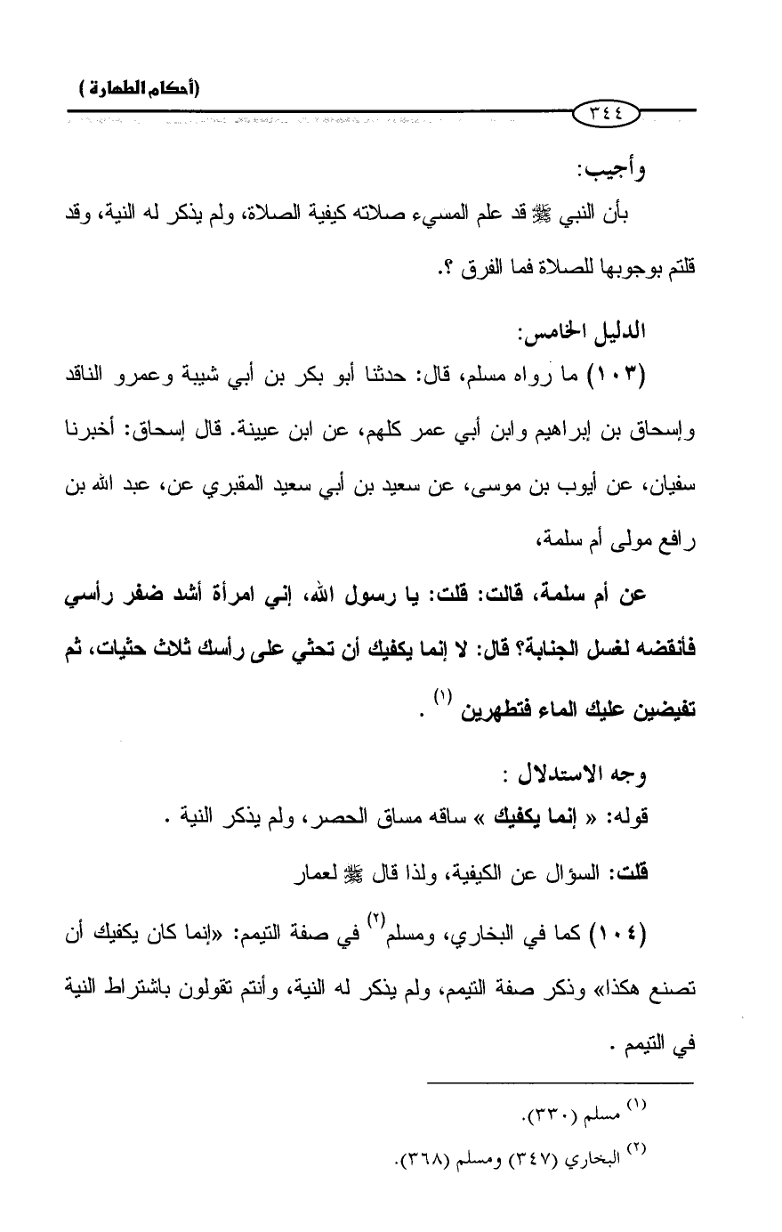 (104) كما في البخاري، ومسلم (¬2) في صفة التيمم: "إنما كان يكفيك أن تصنع هكذا" وذكر صفة التيمم، ولم يذكر له النية، وأنتم تقولون باشتراط النية في التيمم.