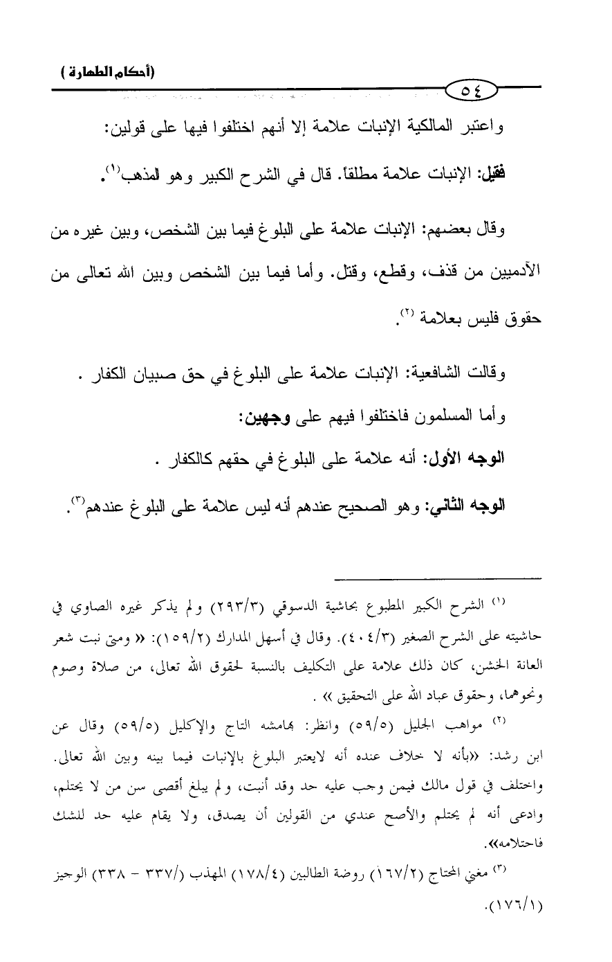 (¬2) مواهب الجليل (5/ 59) وانظر: بهامشه التاج والإكليل (5/ 59) وقال عن ابن رشد: "بأنه لا خلاف عنده أنه لا يعتبر البلوغ بالإنبات فيما بينه وبين الله تعالى. واختلف في قول مالك فيمن وجب عليه حد وقد أنبت، ولم يبلغ أقصى سن من لا يحتلم، وادعى أنه لم يحتلم والأصح عندي من القولين أن يصدق، ولا يقام عليه حد للشك فاحتلامه".