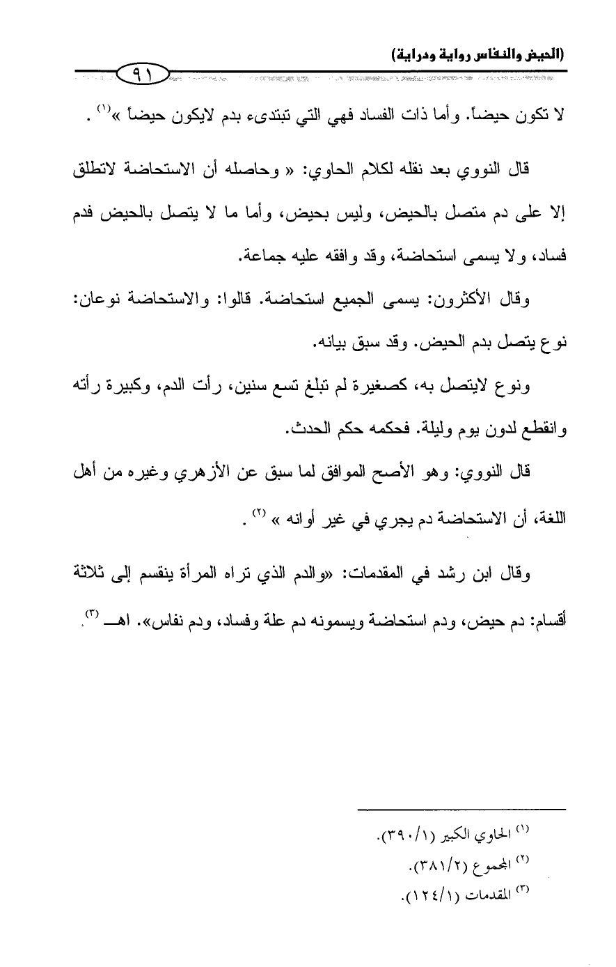 وقال ابن رشد في المقدمات: "والدم الذي تراه المرأة ينقسم إلى ثلاثة أقسام: دم حيض، ودم استحاضة ويسمونه دم علة وفساد، ودم نفاس". اهـ (¬3).