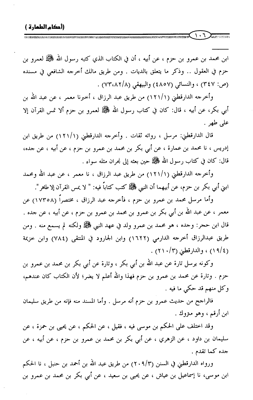 وأخرجه الدارقطني (1/ 121) من طريق عبد الرزاق، أخبرنا معمر، عن عبد الله بن أبي بكر، عن أبيه، قال: كان في كتاب رسول الله - صلى الله عليه وسلم - لعمرو بن حزم ألا تمس القرآن إلا على طهر.